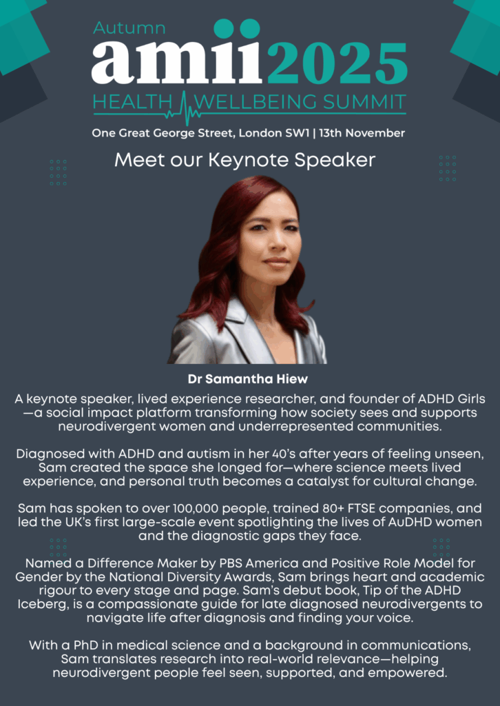 If you haven’t already done so please sign up and join us at the Autumn Summit on 13th November at One Great George Street, London. This year’s event features keynote speaker Dr Samantha Hiew, founder of ADHD Girls, Liam Kennedy of Vitality (and of course amii), Ian Forrester of Cubic Garden, Dr Roshane Mohidin of Aviva and Dr Rebecca Mansfield of Unum, Jill Hambley and Isabella Macfarlane ACII of Insurance Compliance Services Ltd, a UKGI Compliance business, in addition to expert cancer panellists Professor Ben Kelly of Reframe Cancer and Kelly McCabe of Perci Health. Alongside plenty of opportunities to connect and network with peers.
